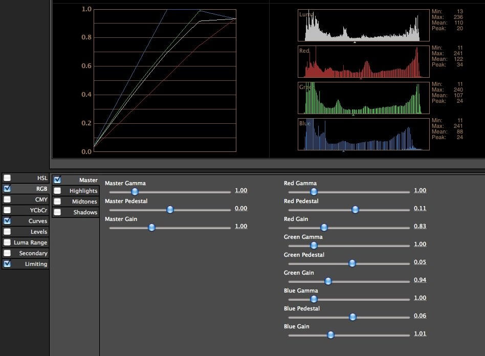 Lets fix our red channel first. Each histogram has a set of controls underneath that will manipulate it. So for the red channel we can tweak it using 'gamma' 'pedestal' and 'gain'. Moving the pedestal figure around will move the whole histogram. Use this to give us a 'Min' number of 10. Then we change the gain, to give us a 'Max' number of 145. Then we use the gamma control to give us a value of around 105. I'll discuss these values in more detail in the next section. Repeat these steps for the green channel, and lastly the blue channel. You'll find the Luma channel will correct itself. Magic!