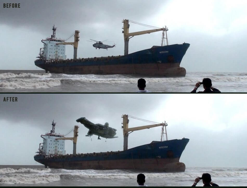 Just a practice shot I made a while ago to show the skills I had picked up with Digital Compositing. You can see the complete breakdown in my Technical Reel. This was a lot more technical then I had first anticipated, with the ship needing to be broken down into many parts. Each of those parts need to be motion tracked (which was done by roto at certain points). Then false lighting, colour matching and a colour pass were added. My most complete and technically challenging composite to date.